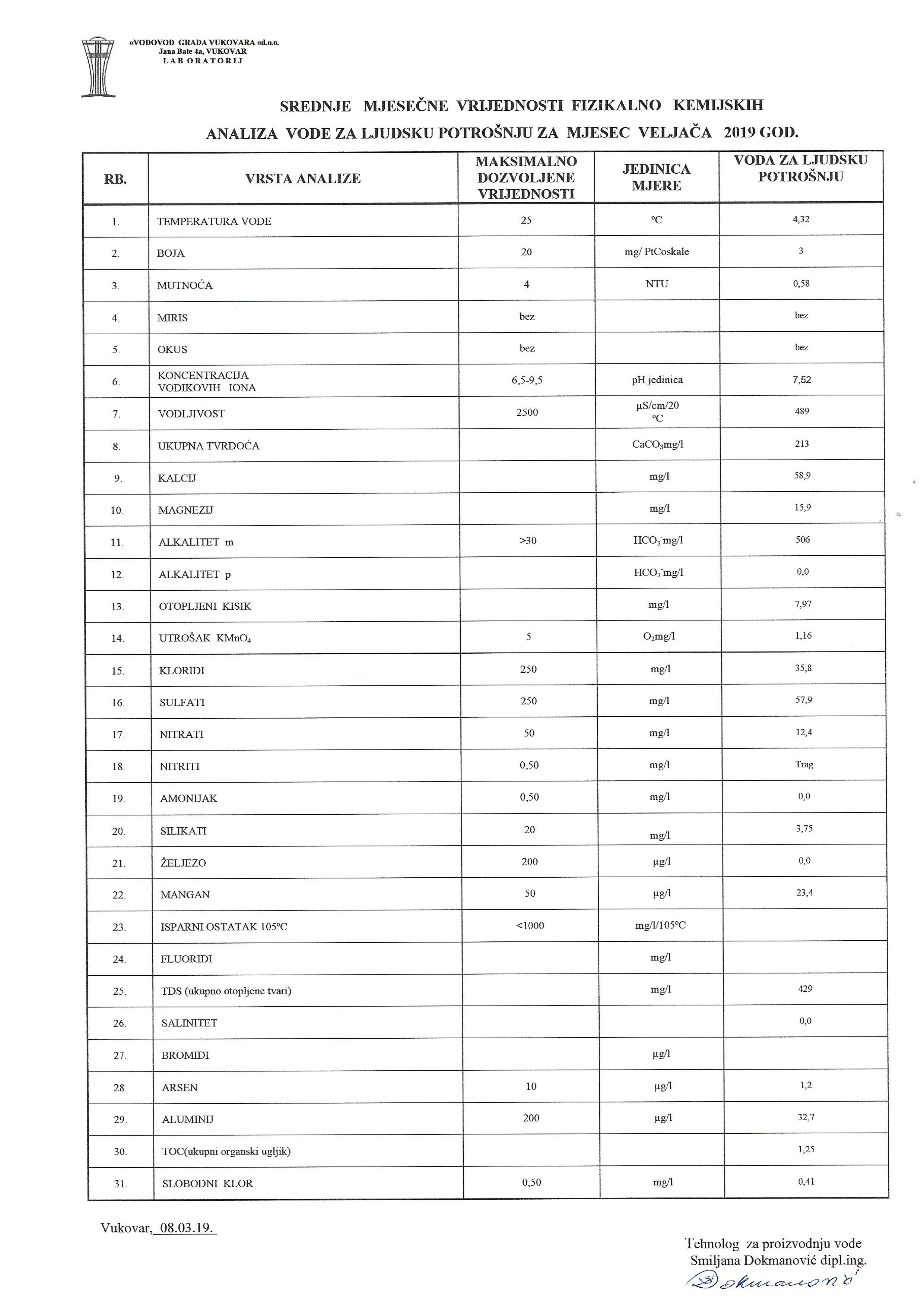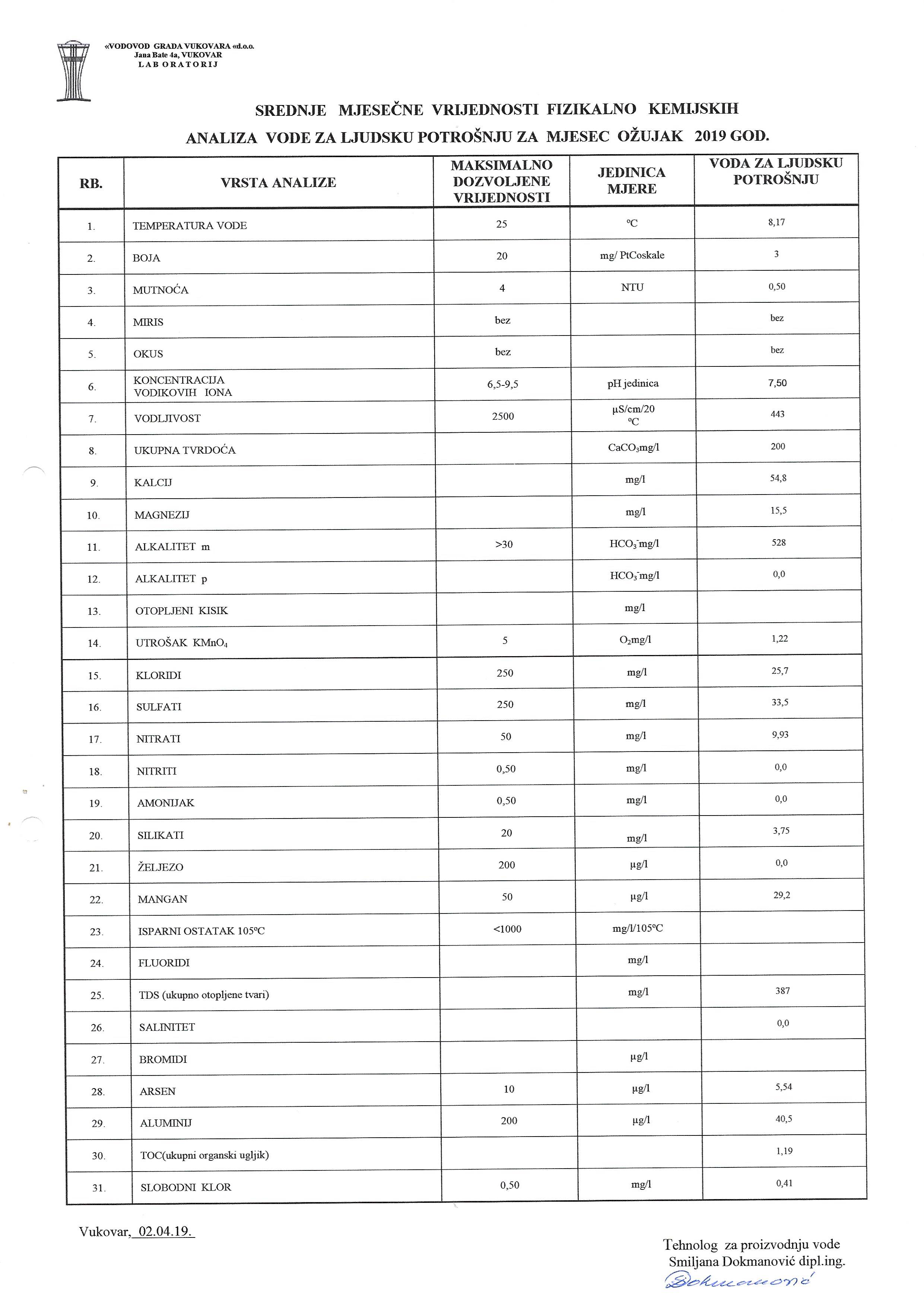 analiza pitke vode – ožujak 2019.
